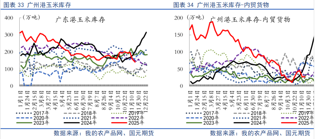 第二阶段:7月初-10月下旬,供需博弈加剧,延续震荡回落格局。三季度玉米期货呈现新作预期压制的震荡偏弱格局。旧作库存偏紧对价格形成底部支撑,而东北产区低温天气引发单产担忧,但新作种植成本因地租下降及政策补贴增加有所降低,市场对新粮价格预期下移限制涨幅。贸易商建库积极性提升,饲料需求受畜禽存栏量支撑保持韧性,深加工需求则以刚需为主后劲不足。期间市场重点关注政策拍卖动态与替代品市场变化,小麦托市收购支撑其价格回升、与玉米价差缩窄,饲用替代规模受限,期价维持持续性走弱行情。