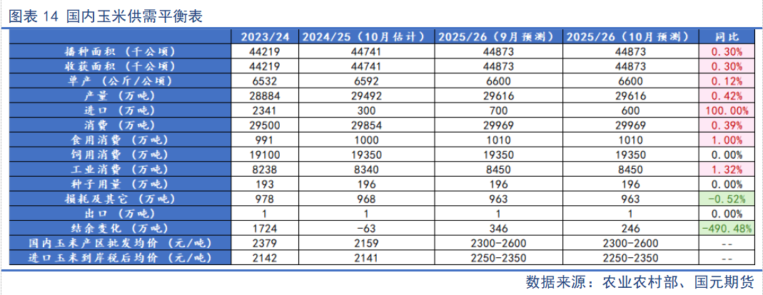 不过当前格局仍存潜在变量:种植期后续极端天气可能扰动单产实际兑现,工业消费扩张的可持续性需观察下游韧性。整体而言,2025/26年度玉米供需紧平衡有所缓解,市场稳定性增强,但需持续跟踪种植端产出、需求端结构变化及进口实际规模,应对供需超预期波动。