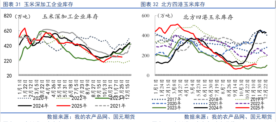 2025年国内玉米库存呈现“全面下降、结构分化、低位回升”的整体特征,北港、南港及深加工领域库存均同比大幅下滑,当前处于新粮上市后的缓慢恢复期。北方四港玉米库存全年呈“持续下滑→低位回升”态势,新粮上市后集港量增加推动库存逐步累积,主因陈粮结转库存枯竭,叠加东北农户惜售及政策收储发力。南港库存降幅更为显著,福建、广西等其他南港库存亦同步下滑,南北港差异源于北港依托产区新粮补给,而南港贸易活跃度低、进口到港减少,主要依赖合同订单执行。深加工领域库存同样维持低水平,企业开机率低于五年均值,补库时对低质量粮源压价、对优质粮源争夺激烈,库存变化的核心驱动因素包括进口量断崖式下滑,替代品进口同步减少,市场从宽松转向紧平衡,政策收储的价格溢价提振农户惜售信心,而黄淮海地区玉米减产与质量问题加剧优质粮源供应紧张。展望年底,北港库存将随新粮上市加速及春节前备货缓慢累积,但仍低于往年同期;南港库存持续低位徘徊,深加工企业原料库存小幅回升但增幅有限,淀粉库存继续缓慢回落至五年均值附近。