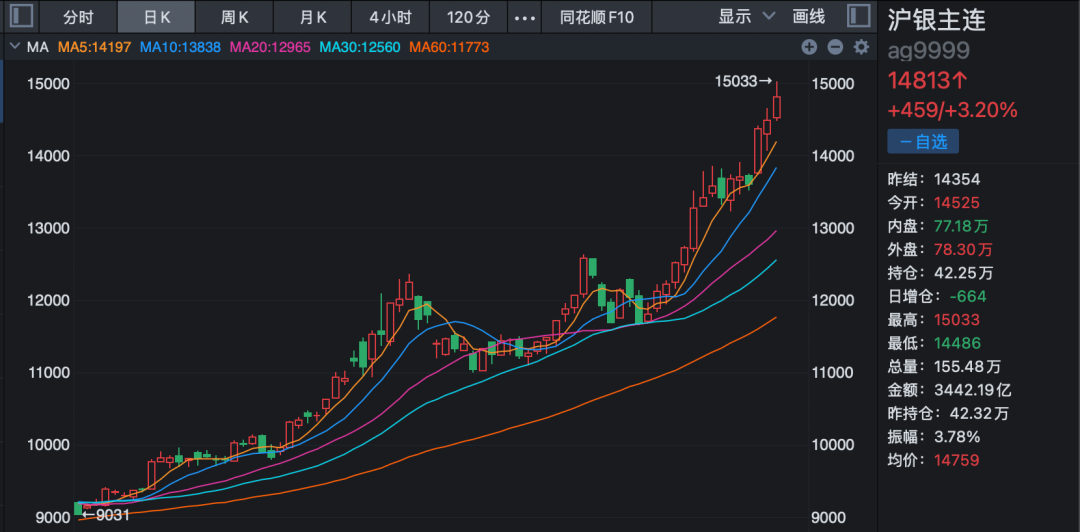 12月12日,国内期货市场沪金、沪银飘红。截至上午收盘,沪金主力合约2602报涨近1%,收于964.7元/克;而沪银大幅上涨3.2%,盘中已击破15000元/千克关口,再度刷新历史新高。