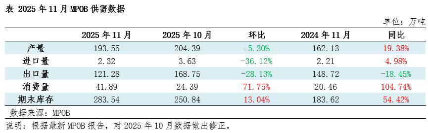马来西亚棕榈油总署(MPOB)发布的11月供需报告整体呈中性略偏空影响。数据显示,当月产量为193.55万吨(环比-5.30%),出口量为121.28万吨(环比-28.13%),国内消费为41.89万吨(环比+71.75%),月末库存增至283.54万吨(环比+13.04%)。与此前市场预估数据相比,出口低于市场预期,月末库存大幅高于预期,报告影响利空,报告落地后棕榈油价格宽幅下跌。