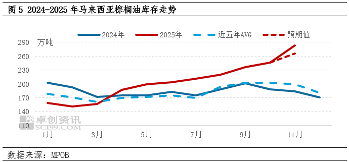 截至11月底,马来西亚棕榈油库存攀升至283.54万吨,较上月增加约32.7万吨,环比增长13.04%,同比上升54.42%,库存水平已升至近五年最高水平。此前市场机构预测期末库存为266万至271万吨,本次报告数据明显高于预期,对价格利空,其主要原因在于马棕出口量宽幅下滑。