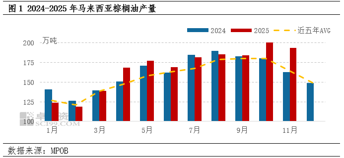 12月10日,马来西亚棕榈油局(MPOB)发布2025年11月棕榈油供需数据。数据显示,当月马棕产量环比虽有回落,但仍处于历史同期高位;同时,由于出口大幅下滑导致期末库存明显高于市场预期,整体报告呈现利空基调。12月,预计马棕基本面延续宽松格局,不排除继续累库可能,国内需求缺乏实质性提振,棕榈油现货价格上行空间有限。