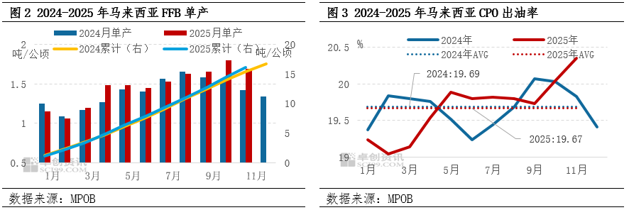 累计来看,2025年1–11月,马来西亚FFB单产为16.12吨/公顷,同比增长4.88%;同期CPO平均出油率为19.67%,较2024年同期下降0.02个百分点。