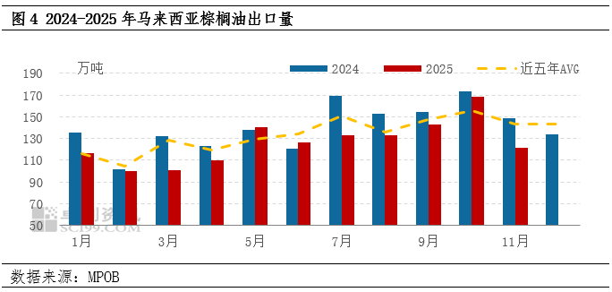 11月马来西亚棕榈油出口量为121.28万吨,环比下降28.13%,低于近五年平均水平。从主要进口国需求表现来看,印度11月棕榈油进口量预计环比小幅上升至64万吨,中国11月进口量也有望增至30万吨以上,这对产地出口构成一定支撑。但由于月内市场普遍预期印尼将于12月下调棕榈油出口关税,导致部分出口需求后延至12月并转向印尼,进而挤占了马棕当月出口份额,使得11月马棕出口明显萎缩。整体而言,本次报告出口数据显著低于市场预期,对棕榈油价格走势带来利空影响。