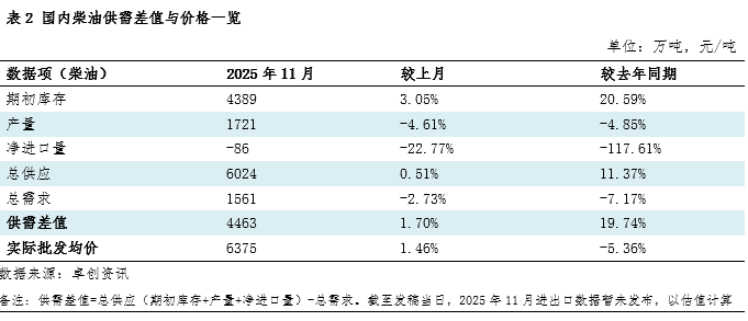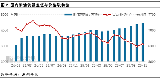 对比去年同期数据,2025年11月柴油供需差值同比增长19.74%,实际批发均价同比下降5.36%。柴油供需差值与批发价格在趋势上呈现反向联动规律,但供大于求的局面未对价格形成等量压制,基本面对批发价格影响相对有限。