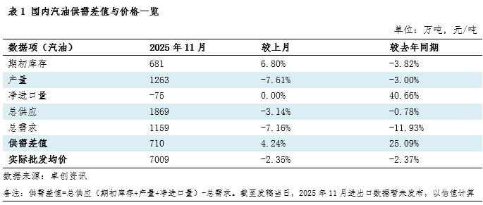 2025年11月,国内汽油、柴油供需差值均增加,但差异性表现在对实际批发均价的影响方面,汽油供需差值的变化对价格形成一定的压力,因此实际批发均价反向下滑,但柴油供过于求的情况对价格未形成有限压制,柴油价格的变动更倾向于利好对需求的刺激程度与市场备货情绪的变化。预计12月份汽油供需差值仍将维持增长预期,柴油则趋向于当前位置企稳。