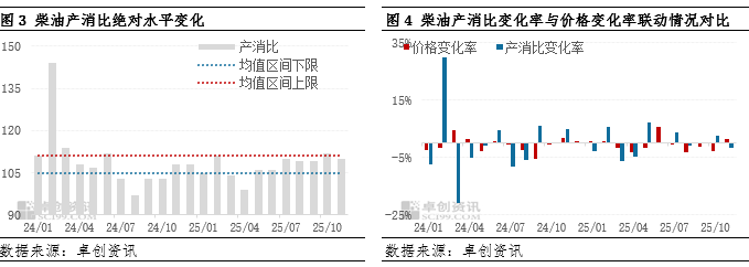 探索2017年至今柴油产消比与价格之间的联动情况。本期数据表明,11月份国内柴油市场生产与消耗层面的供需关系的表现为“接近历史供需均值区间上限、即将冲破供需平衡局面”。2025年11月,国内柴油产消比为110:100,较上期下降2个单位,本期处于均值区间内。这表示在不考虑中间贸易环节的情况下,柴油生产与消费表现相对均衡。本期产量降量较消费量降量多39万吨,使得柴油产消比再度回归均值区间,但临近上限边界。从图4来看,本期价格变化率与产消比变化率反向联动,产消比回归均值区间的同时对柴油均价形成一定支撑。