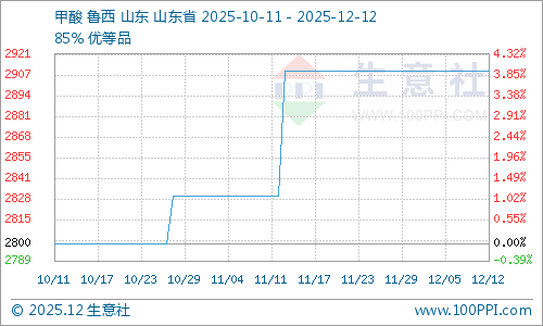 据生意社商品行情分析系统显示:近期国内甲酸价格问稳定运行,截至12月12日,生意社国内85%工业级甲酸基准价2910元/吨,较上周同期(12月5日)持平,环比上涨2.83%,同比上涨4.86%。