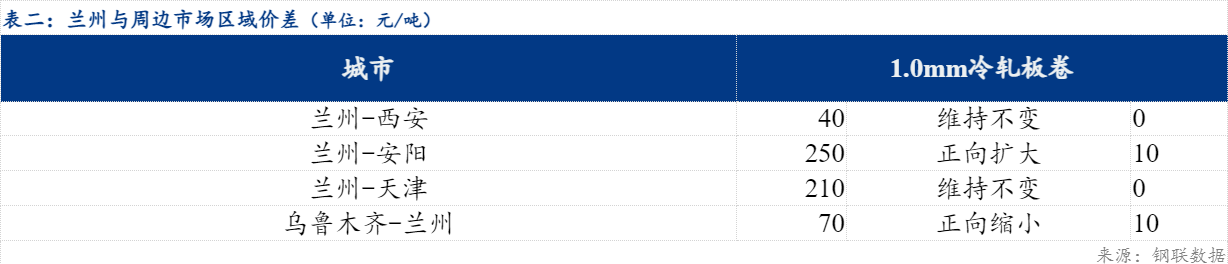 价差方面看,今日兰州与西安市场价差维持不变、与安阳市场价差正向扩大10元/吨、与天津市场价差维持不变、与乌鲁木齐市场价差正向缩小10元/吨。品种价差看,今日镀冷价差正向缩小30元/吨,冷热价差正向扩大10元/吨。