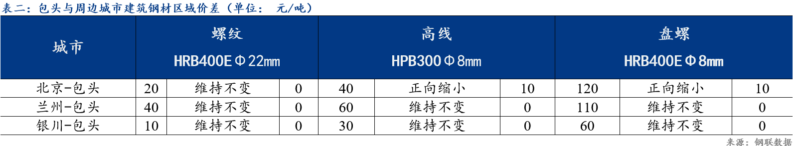 今日包头市场价格弱稳运行,与全国主要市场价差收窄;截至发稿,北京、兰州、银川等主要标的市场螺纹钢与包头市场价差(10)-(40)元/吨,高线价差(30)-(60)元/吨,盘螺价差(60)-(120)元/吨。对比北京市场河钢大螺纹钢价格,北京市场河钢HRB400EΦ22mm大螺纹钢价格高于本地20元/吨,主要由于今日北京及本地市场价格均平稳为主。