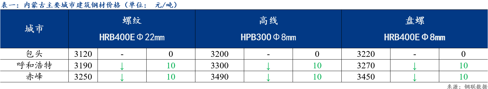 今日包头市场主流资源报价弱稳运行,目前包钢大螺纹基价3120元/吨左右,市场成交清淡;亚新钢厂出厂价平稳,目前大螺纹出厂价3200元/吨,盘螺出厂价3200元/吨,钢厂资源基本齐全,厂提优惠100-120元/吨;今日申银、内蒙古建龙钢厂资源价格平稳,目前市场大螺纹主流价格2960元/吨,成交较差,赤峰市场价格小幅下跌。