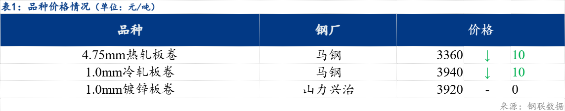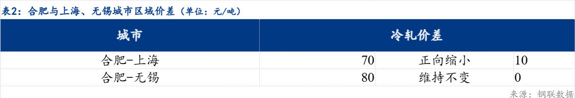 今日合肥-上海1.0mm马钢价差为70元/吨,较上一交易日正向缩小10元/吨;合肥-无锡1.0mm马钢价差为80元/吨,较上一交易日持平 ;品种价差方面:冷热价差580元/吨,较上一交易日持平 。