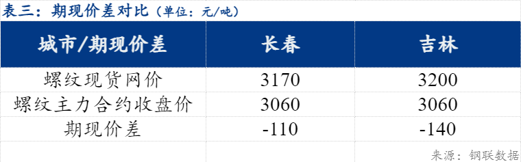 今日期螺主力合约与省内长春市场螺纹钢现货价差-110元/吨、期螺主力合约与吉林螺纹钢现货价差-140元/吨。