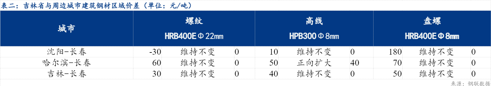 今日沈阳-长春螺纹、盘线价差维持不变,哈尔滨-长春螺纹、盘螺价差维持不变、高线价差正向扩大40元/吨,吉林-长春螺纹、盘线价差维持不变。