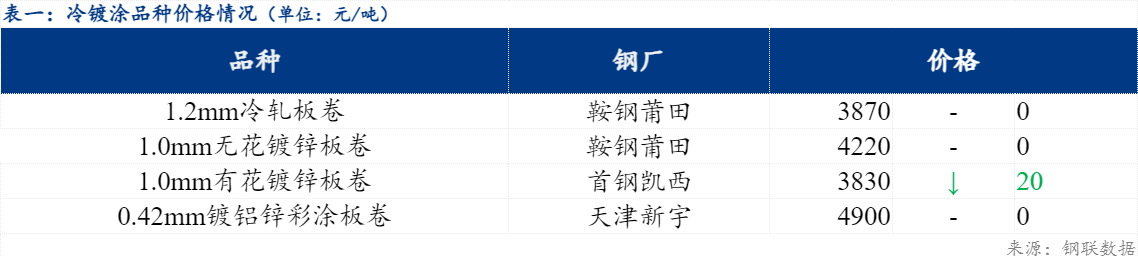 品种价差来看,镀冷价差50元/吨,较上一交易日反向扩大20元/吨;镀热价差490元/吨,较上一交易日维持不变;冷热价差540元/吨,较上一交易日正向扩大20元/吨。区域价差来看,冷轧品种,福州-上海价差100元/吨,较上一交易日维持不变;福州-广州价差40元/吨,较上一交易日正向扩大20元/吨。