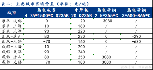成都中板较上海高190元/吨,较天津高240元/吨,较唐山高250元/吨,较无锡高180元/吨。