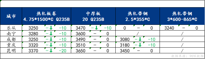 乐从热卷较上海高10元/吨,较天津高90元/吨 ,较唐山高80元/吨,较无锡低70元/吨;