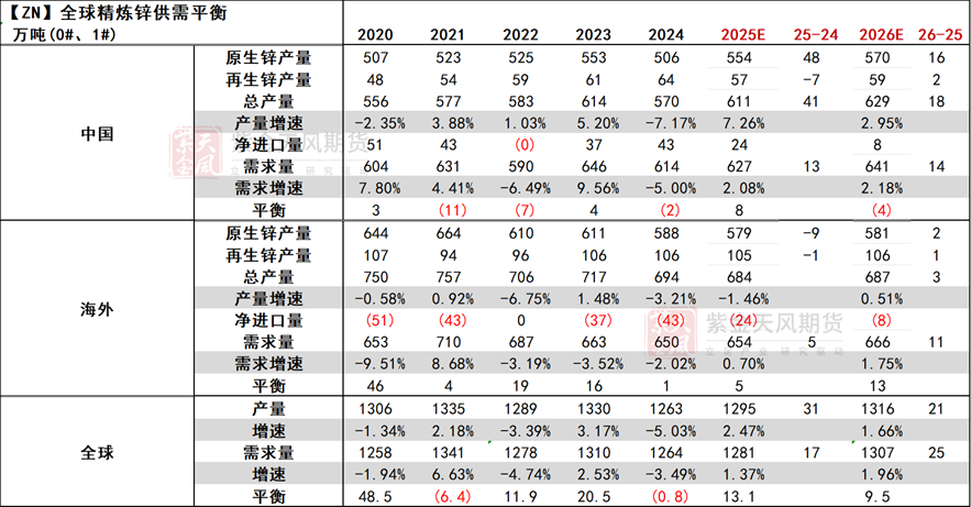 需求预期方面,我们认为26年宏观大背景为中美经济同步上行。美国财政货币双宽松,经济步入温和复苏与主动补库周期;而国内“十五五”开局,积极的政策基调不改,地产对需求增长的拖累有望大幅度减弱。另外,全球新能源、电力、算力中心建设对锌需求的带动也将逐步显现。(需求分项测算请详见后续年报)