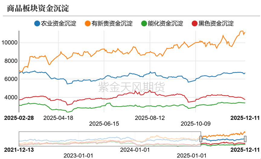 近期,市场资金基于“货币宽松”与“供需趋紧”的双重逻辑,在金属板块进行广泛配置,贵金属与有色金属均有显著资金流入,12月12日单日,贵金属板块净流入84.65亿元,有色板块净流入42.99亿元,大幅领先其余板块。有色金属方面,以铜、铝、锡为代表的“新经济”品种获得大量资金青睐,铜价更是持续突破历史新高。