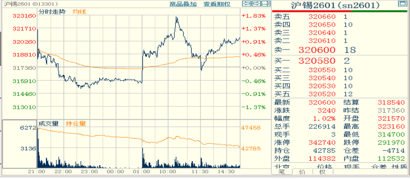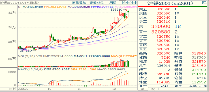 当日(20261211)沪锡2601合约以321570元/吨的起点短暂冲高,盘中触及323160元/吨的日内高点后承压回落,最低下探至314700元/吨,随后在多重支撑因素推动下逐步反弹,最终以320600元/吨收盘。今日成交量为226914手。