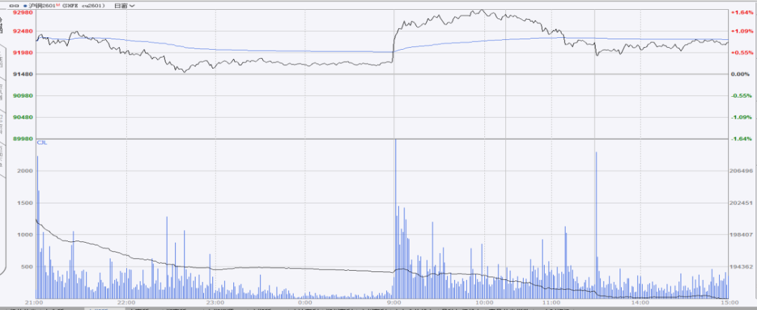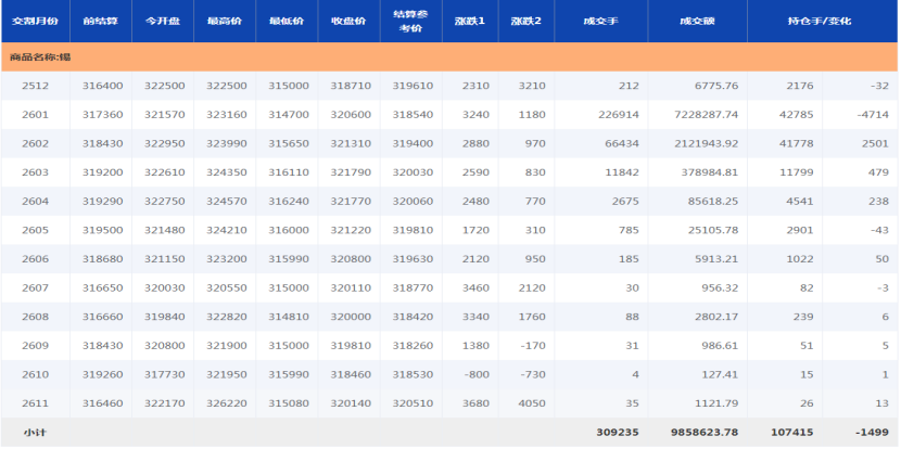 沪锡期货12个合约,品种总成交量为309235手,沪锡合约总持仓量为107415手。其中沪锡合约2601持仓量为42785手。