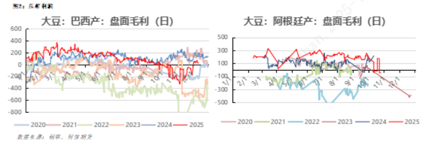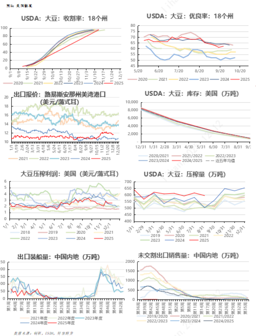 (2)美国方面:美国目前收割基本完成,后续关注美国出口需求能否如预期恢复,市场目前预计采买了美豆约300-400万吨,能否如期完成或存疑。