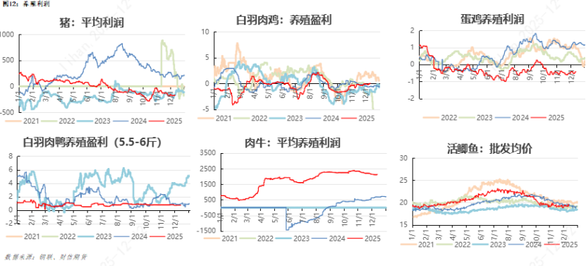 3、养殖利润:重点畜禽产品中生猪养殖利润平均亏损-250元/头,鸡蛋-0.42元/斤,肉禽整体养殖利润一般,白羽肉鸡处于盈亏平衡线附近,青脚麻鸡2.28元/只,817肉杂鸡0.63元/只,白羽肉鸭0.73元/只,肉牛养殖利润较好,肉牛养殖利润2100+元/头左右,较前期有所下降,水产价格与去年同期水平基本持平。综合来看,养殖利润水平一般。