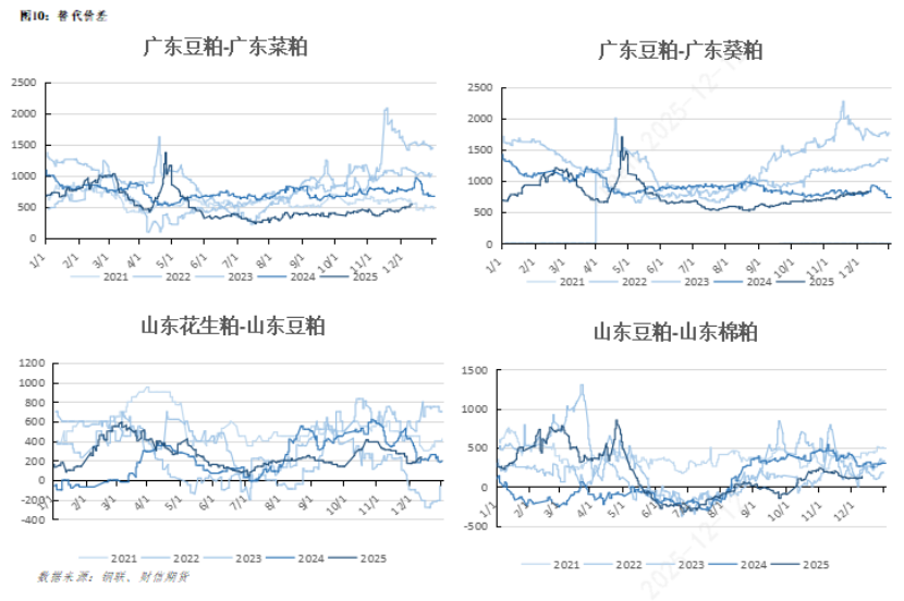 2、替代价差:从广东地区来看,豆粕-菜粕价差在500-600元/吨,豆粕仍略有性价比,豆葵价差在800-900元/吨左右,豆粕性价比有限;从山东地区的花生粕、棉粕角度来看,豆粕与棉粕价差在100-150元/吨左右。