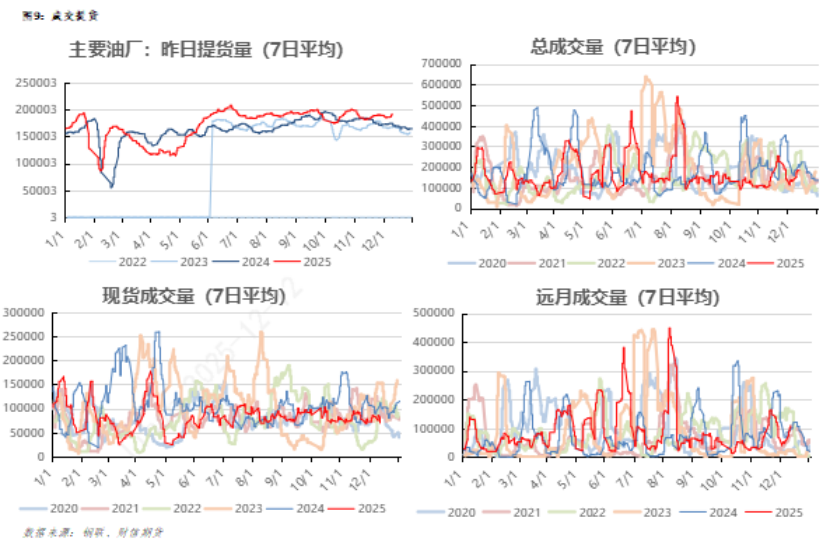 1、提货成交:远月成交经过前期集中补库后目前成交趋于平淡,现货成交较远月成交相对积极,提货量较上周亦环比走弱,表明下游整体仍维持随采随用的策略为主,远月成交积极性不佳。
