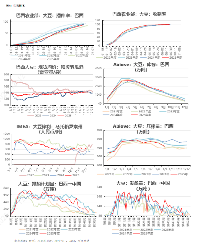 7、巴西播种进度略慢,但目前播种进度接近尾声,后续市场主要关注点将转移至巴西天气对单产的影响上,从气象模型来看,未来巴西降水增多,给予市场对巴西大豆丰产预期的信心。