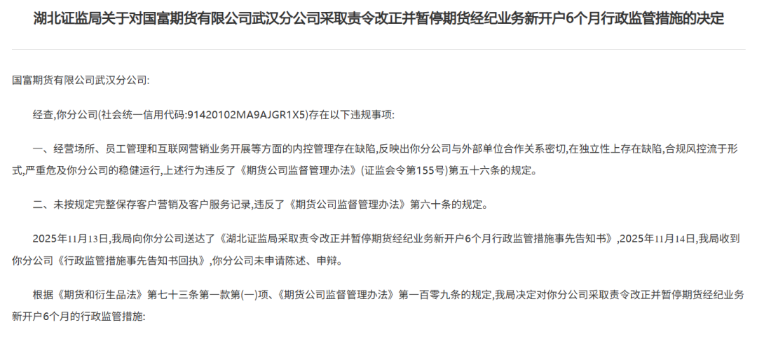 11月25日,国富期货有限公司武汉分公司因存在“经营场所、员工管理和互联网营销业务开展等方面的内控管理存在缺陷,反映出分公司与外部单位合作关系密切,在独立性上存在缺陷,合规风控流于形式,严重危及分公司的稳健运行”等问题,被湖北证监局暂停期货经纪业务新开户6个月。