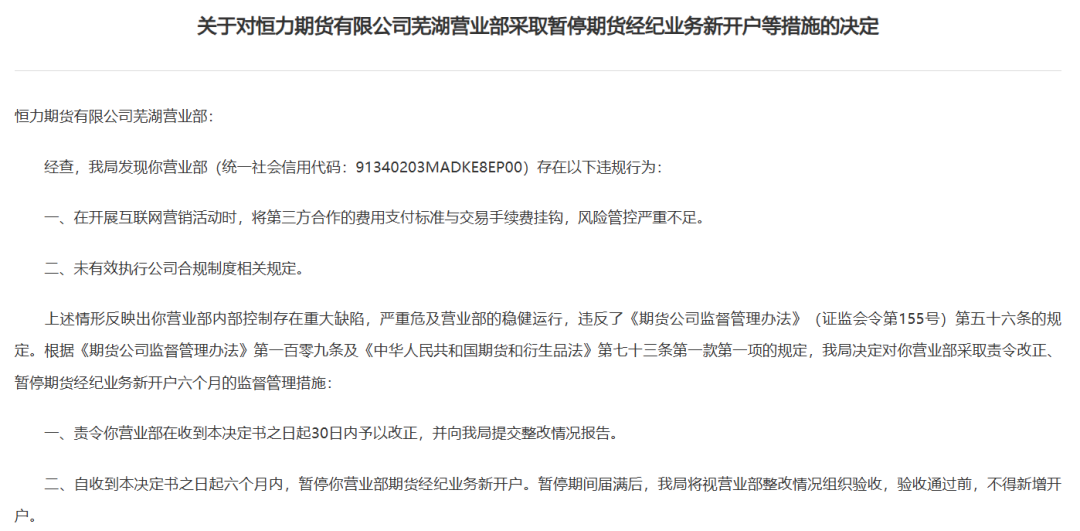 上述情形反映出营业部内部控制存在重大缺陷,严重危及营业部的稳健运行,违反了《期货公司监督管理办法》(证监会令第155号)第五十六条的规定。根据相关规定,安徽证监局决定对恒力期货芜湖营业部采取责令改正、暂停期货经纪业务新开户六个月的监督管理措施。