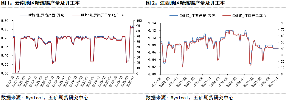 国内11月精锡产量较上月预期基本相近。云南和江西两地锡锭冶炼企业的开工情况整体呈现出高位持稳态势。云南地区大型冶炼厂之前的季节性停产检修已基本结束,生产活动逐步恢复,使得该地区开工率保持稳定。同时,江西地区的冶炼企业则面临再生原料(废锡)供应显著不足的困境,年底消费不佳导致废料流通量减少,使得当地精锡产量持续维持在偏低水平。综合来看,尽管生产从检修中恢复后趋于平稳,但在原料供应瓶颈和需求端“畏高”情绪的双重制约下,预计两地冶炼企业的开工水平短期内难以显著提升。