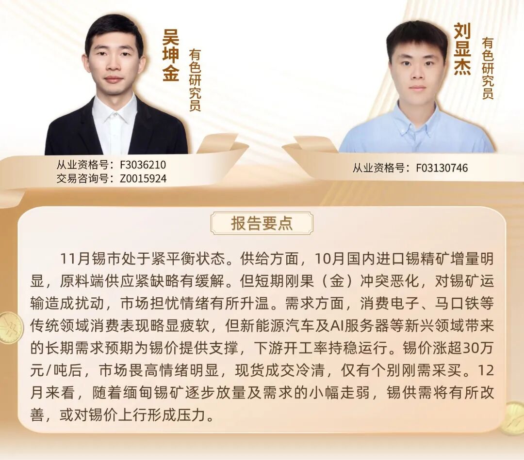 整体来看,11月锡市处于紧平衡状态。供给方面,10月国内进口锡精矿增量明显,原料端供应紧缺略有缓解。但短期刚果(金)冲突恶化,对锡矿运输造成扰动,市场担忧情绪有所升温。需求方面,消费电子、马口铁等传统领域消费表现略显疲软,但新能源汽车及AI服务器等新兴领域带来的长期需求预期为锡价提供支撑,下游开工率持稳运行。锡价涨超30万元/吨后,市场畏高情绪明显,现货成交冷清,仅有个别刚需采买。12月来看,随着缅甸锡矿逐步放量及需求的小幅走弱,锡供需将有所改善,或对锡价上行形成压力。