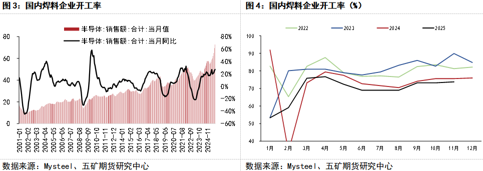 需求方面,半导体行业延续景气,国内锡焊料企业开工率呈现维稳态势。11月份样本企业锡焊料产量环比增加0.95%,开工率较10月份小幅上涨0.69%。
