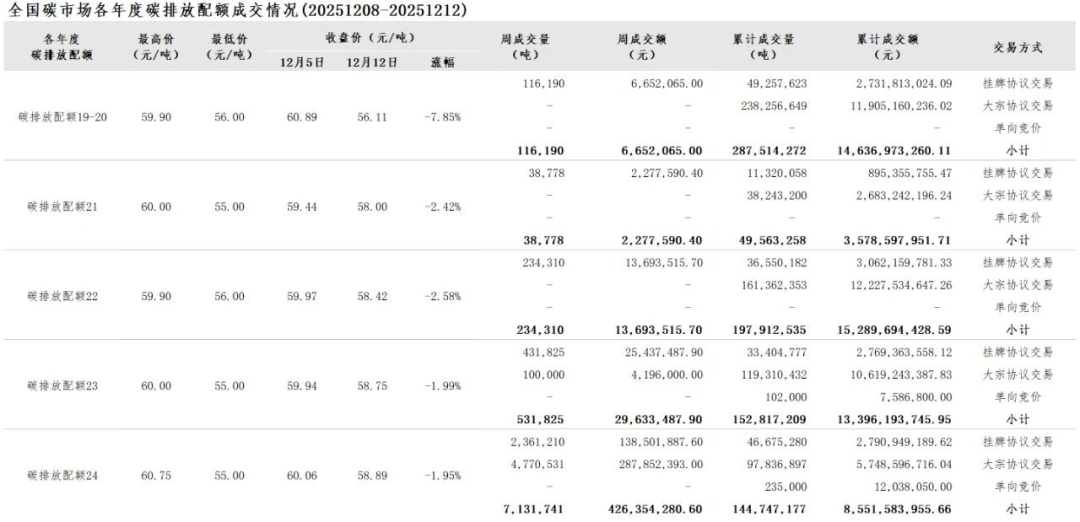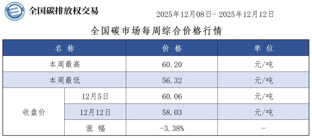 【CEA周报】全国碳市场每周综合价格行情及成交信息20251208-20251212