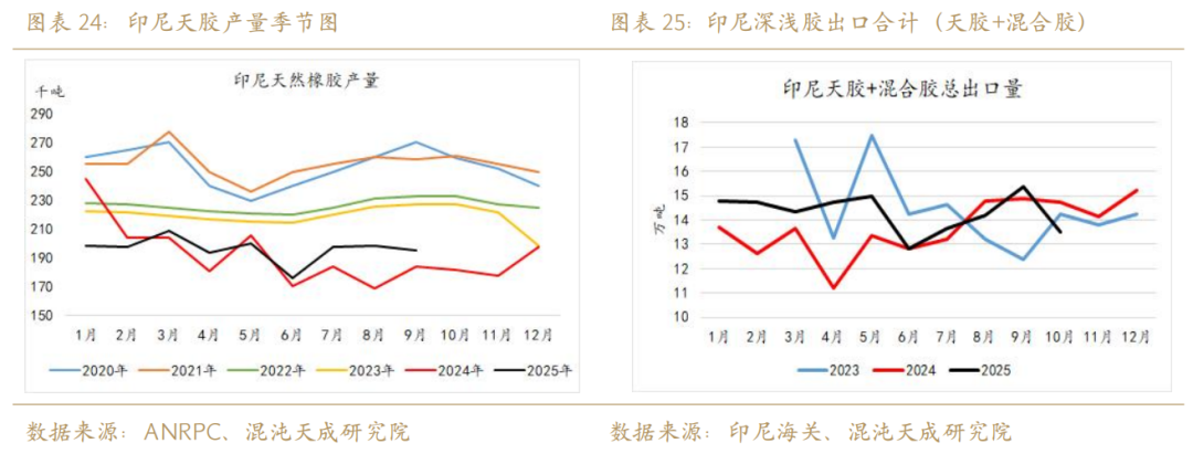 近端供应来看,25年前三季度印尼出现了超预期的产量增长,但其10月出口数据似乎能看出一些生产潜力(包括产地库存)已有所透支的端倪,虽然印标出口下滑这一事与国际需求的弱势有关,但我们总体还是保持印尼产能已见上限的判断。数据显示,2025年1-9月印尼累计产量176.7万吨,同比去年同期逆势增长1%,2025年10月印尼深浅胶合计出口13.52万吨,同比去年大幅下降8.2%。