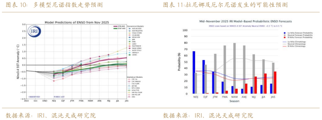 根据IRI综合气象学模型预测,2026年1月到9月,NINO3.4指数重心由-0.5向0.5转移,代表东南亚主产区的气候由偏拉尼娜过渡到偏厄尔尼诺,即降雨的可能性减小而干旱的可能性增长。具体来看,从图表中可见从26年1月开始厄尔尼诺发生可能性逐月增长但截止到9月也未能超过40%,故而我们认为2026年主产国前三季度的气候状况可能中性为主。