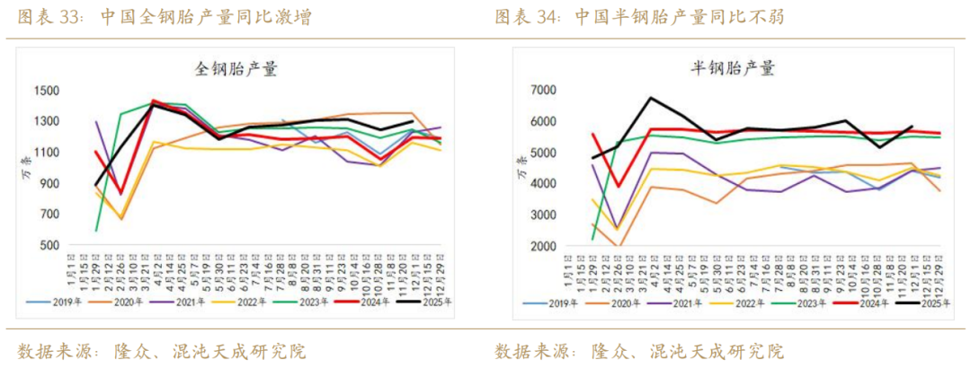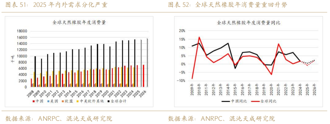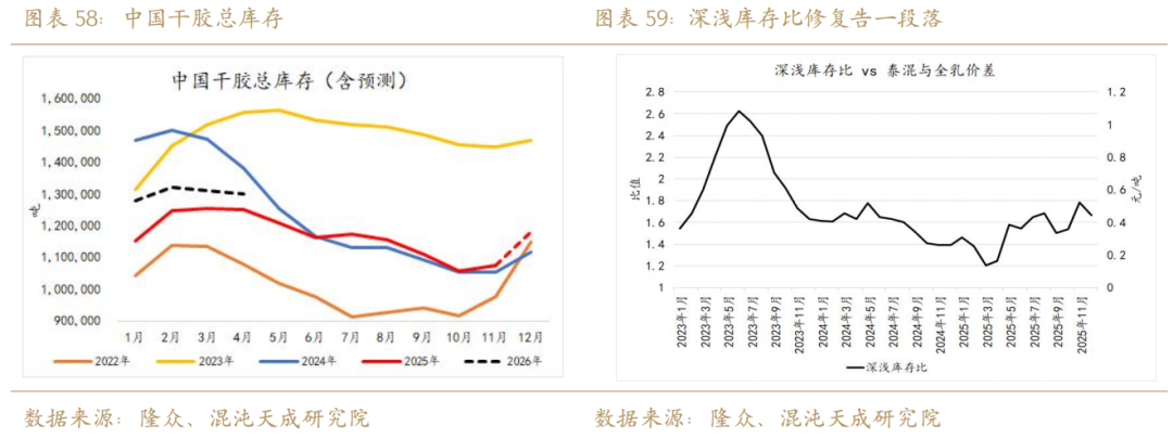 首先从政策端来分析,2024到2025年的一个重大变量在于国储,这一“不透明”的蓄水池在近两年释放了大量库存,直接造成了全乳的过剩,极大的影响了国内深浅胶强弱格局。目前国储库存或已经见底,2026年或是收储预期强于抛储预期的一年,国储总库存有望回补。但鉴于2024年抛储后的2025年强收储预期未能被兑现(平衡之下这两年的抛储大于收储),2026年是否能开启大量收储的这一命题需要谨慎对待,也要警惕国储是否存在市场未知的隐性库存(比如更多的老全乳)。