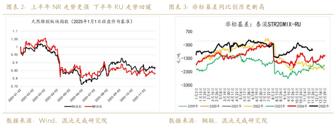 2025年另一逆预期是深浅的正套行情,产生这一偏差的主因一是传统非标套利盘过于拥挤,二是今年国储持续抛储浅色导致浅色过剩。在天然橡胶交易领域中,泰混-RU的价差变动对行情有着极大的影响。今年一二季度非标基差同比偏强的主要逻辑是深浅库存比过低(包括显性库存较低支撑NR挤仓这一逻辑),三季度非标基差同比增幅进一步加剧的主要逻辑是抛储导致浅色过剩格局。而10月底泰混-RU终于迎来反套,主要逻辑是泰国进入旺产季后国内深色累库斜率的加剧修复了一部分国内近端深浅供需失衡情况。