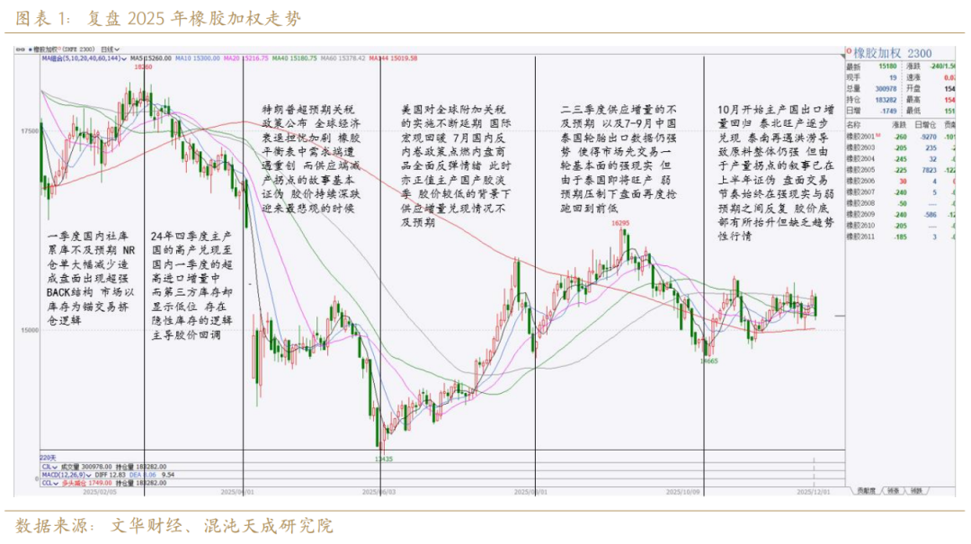 25年的胶价整体是先抑后扬的,在上半年,多空双方围绕大周期产量拐点的主线叙事展开博弈,最终多头逻辑遭到主产国出口同比大幅增长+国内社库持续逆季节性累库的双重证伪,宏观层面亦现关税黑天鹅,胶价迎来惨烈下跌;下半年的胶价整体底部抬升,由于其自身基本面矛盾不够突出,其走势与工业品指数高度拟合。总体来说,胶价在25年6月构筑的底部已非常夯实,但在供需双增的格局下其估值难以出现趋势性突破,需等待26年一季度累库高度来验证本轮旺季产量,或中间再出现新的宏观驱动力(类似反内卷)。