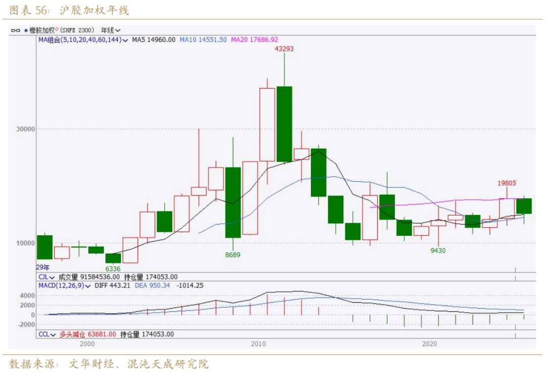 估值角度,我们以橡胶年线来看,24年和25年沪胶都曾挑战20年均线后失败,故而结合平衡表中26年缺口放大的预期来看,明年胶价或仍以20年均线(17686元/吨)为压力位但存在突破的希望,以5年均线和10年均线之间的位置为关键支撑,那么胶价运行区间可能是在14550元/吨到17686元/吨之间,胶价重心相较于2025年目前的加权均价15669元/吨来说,应该有所抬升(表达平衡表缺口放大)。从更长周期的视角去看橡胶年线,2014年开始沪胶年线出现MACD死叉代表其正式进入技术性上的漫长熊市,直至2025年下跌动能持续收敛但仍未出现明确的年度级别上涨动能,未来预计胶价重心持续抬升的趋势不变,随全球产量拐点出现,沪胶年线或见MACD金叉后开启牛市,在漫长的探索和纠偏的过程中橡胶的成长值得我们等待。