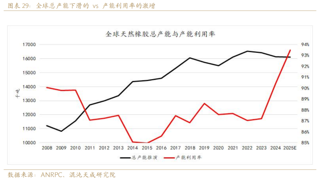 2025年全球天胶总产量大约为1504万吨,同比2024年增长3.19%;2025年全球天胶总产能大约为1609万吨,同比2024年下滑0.2%;产能利用率大约为93.4%达到历史最高水平,同比去年增长3%。对于2026年,我们预测产量可能还是保持小幅增长的趋势,最终或达1519万吨,同比增长1%:核心原因在于泰国目前难以见到产量同比大幅波动的情况,以及科特迪瓦大概率持续提供增量来弥补其余东南亚产地的减产,最终造成的结果依旧是全球总产量同比波幅收敛,后续我们只能不断观测天气、胶价、产量三者的传导关系来摸索和验证全球总产量的拐点。关于全球天然橡胶总产能数据推演方法:首先用总种植面积- 开割面积得到表观未割面积,再用表观未割面积 - 过去五年新种面积(还未能开割的新树)得到实际未割面积,这部分面积代表了可割而未割的胶林,更符合闲置产能的概念。然后假定这部分闲置产能的单产水平为正常产能的1/2(通常都是老树或病树),用当年的ANRPC主产国总产量 + 闲置产能 * 单产得到ANRPC主产国总产能,最后以ANRPC产量占全球总产量的比例折算出全球总产能。从总产能推演我们可以看到,2022年全球天然橡胶总产能已经见顶下滑,尽管在24/25年总产能降速趋缓,但未来继续下滑的大趋势或仍然难以逆转。