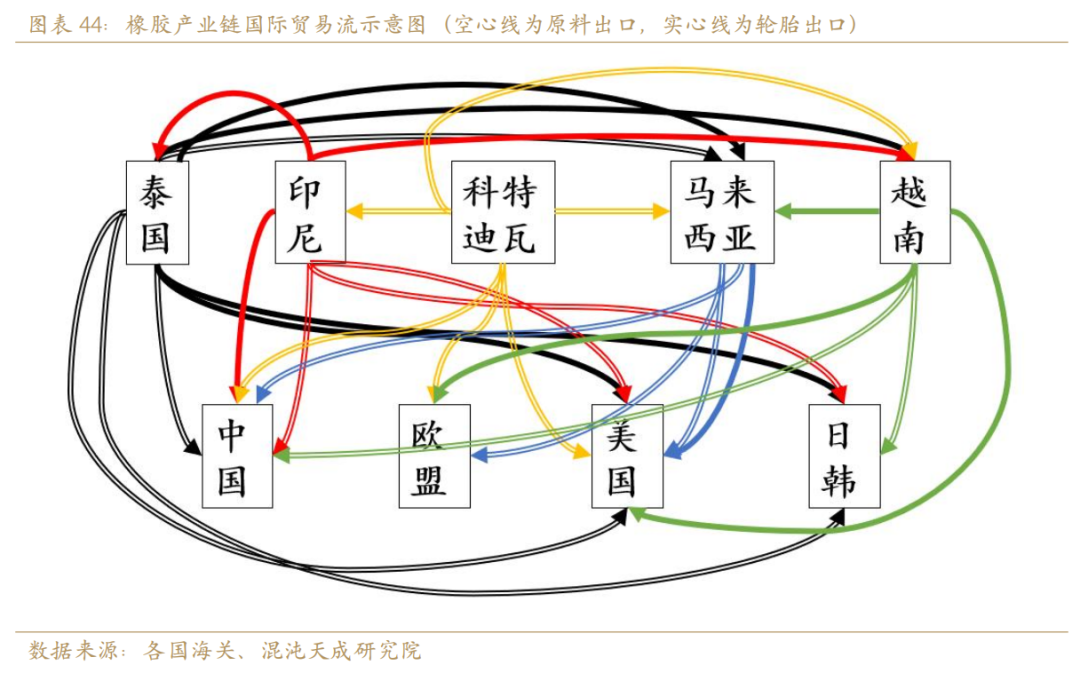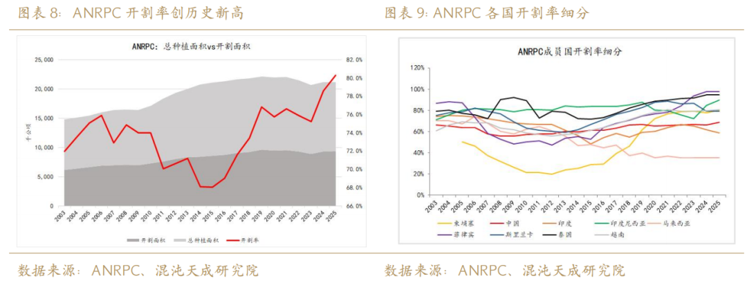 在天气难以预测的情况下,我们认为传统产胶国单产增长的最核心途径可能是:价格刺激下重启弃割的树林从而使得开割率出现显著提升。从25年ANRPC最新预测数据可以看到,用开割面积/总种植面积得到的开割率处于历史极值,而开割率前三的传统产胶国:菲律宾、泰国、印尼,其产能利用率基本封顶:89.38%-94.6%。那么延续这个角度来看,柬埔寨、越南、中国和印度可能是未来产能利用率更有提升潜质的国家;而像马来印尼由于其棕榈替代效应的加剧和向加工中转国的这一角色定位的倾斜,其胶林产能利用率再增长的概率较低。