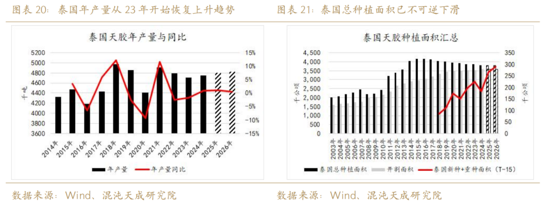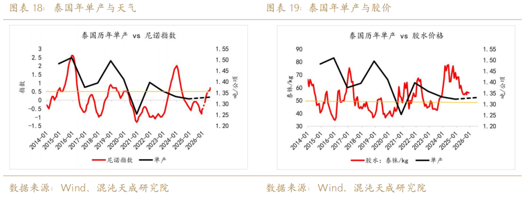 关于这一结论的进一步解释是,泰国原料重心提升已是不可争之事实,那么未来高价刺激积极性的这一效应或长存,这一点用泰国地区高达94.6%的开割率来表达。天气方面我们将2026年的割胶物候环境定性为优于2025年(更趋于中性的天气指数),那么在天气转好+总割胶面积下降的这一正一负的两个因子的作用下,最终泰国2026年产量有可能继续增长,但幅度大概率较小,这一结论与我们上文中提及的产量同比波动率收窄的概念相衬。