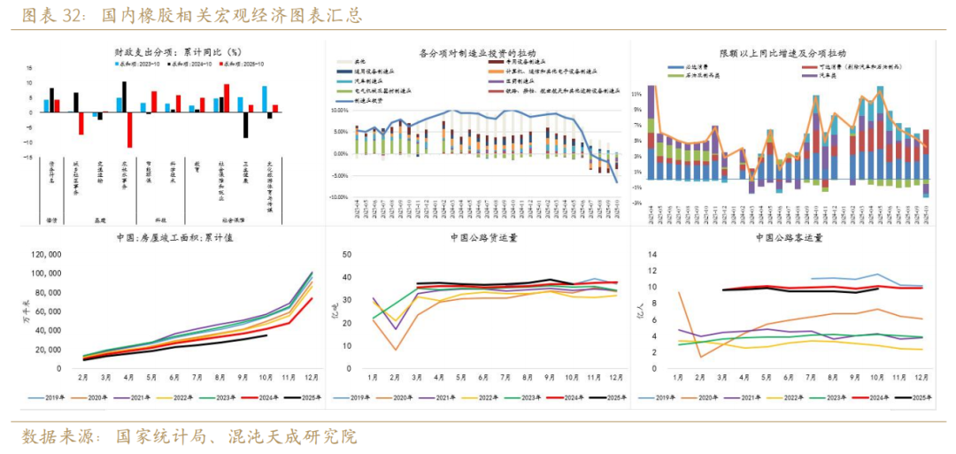 2025年国内宏观经济对橡胶需求的支撑理应是较弱的,主要拖累是地产基建处于下行周期,汽车制造业投资同比增速收窄及10月转负。从近三年的财政支出拆解来看,2024年是财政支出偏向化债和基建的,2025年的财政支出是重视科技、社保,而大量减少基建相关。