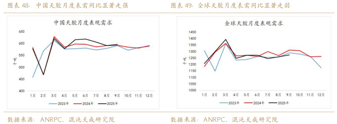 让我们再回头直观地看天胶需求:2025年前三季度内外需求强弱分化明显,数据显示,2025年1-9月中国天胶表需为527.8万吨,同比增长0.91%;2025年1-9月国际天胶表需为619万吨,同比减少1.52%。这里可能代表的概念是,尽管国内需求极为强势,但国际需求的减量亦大于了国内需求的增量,故而从前三季度来看全球天胶总需求可能是略微下滑的。