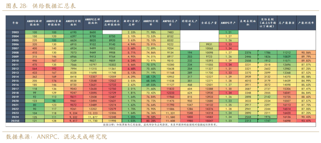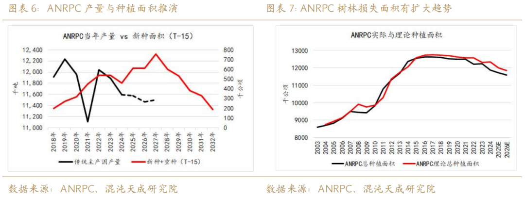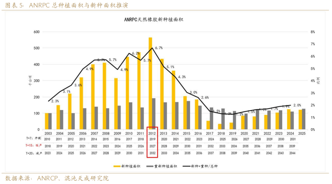 时间上以2012年的高峰新种为起点,生长周期上以胶树15年进入旺产季来线性外推,ANRPC主产国的理论天然橡胶产量高点应在2027年,理论产量拐点应在2032年后——即理论上2027年东南亚主产国见到产量增长斜率的峰值,2032年后见到产量同比转负。