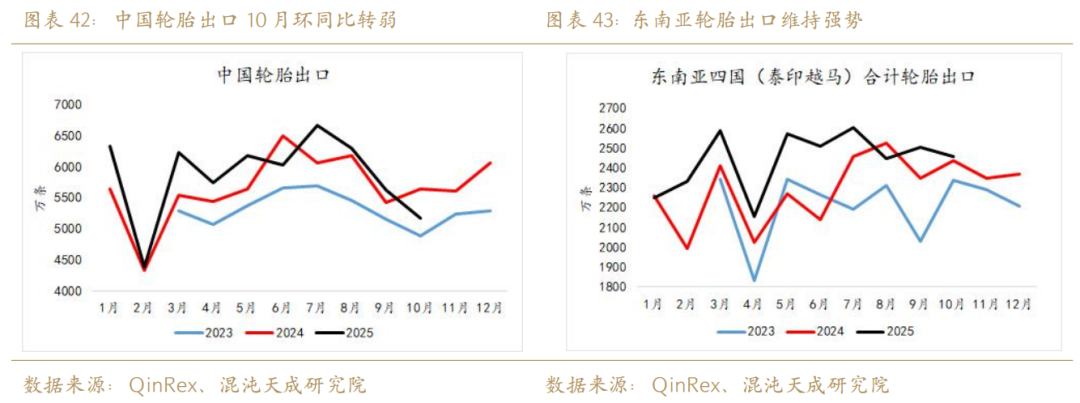 2025年10月我国轮胎出口出现断崖式的环同比下滑,4月初贸易战预期导致的抢出口透支需求一事是存在的,我们认为四季度国内轮胎出口数据可能会进一步转弱,东南亚的轮胎出口或亦难维持强势。数据显示,2025年10月中国轮胎出口5173万条,环比下滑8.12%,同比下滑8.21%;2025年1-10月,中国累积出口轮胎5.8亿条,同比去年增长4%。而东南亚的轮胎出口数据至今表现较好,主因可能是东南亚地区轮胎出口美国的综合税率落地后胎厂的压力并不大:一是在8月泰美谈判成功后其轮胎出口美国税率定格在19%左右,远低于预期;二是由于美国轮胎需求旺盛促使部分轮胎进口商表示愿意承担大部分税率压力。数据显示, 2025年1-10月,东南亚四国累积出口轮胎2.4亿条,同比去年增长6.8%。不过对于东南亚胎企来说,在谈判成功前基于贸易战逻辑进行出口前置一事亦是存在的,需要持续关注后续两个月的出口数据是否转弱。